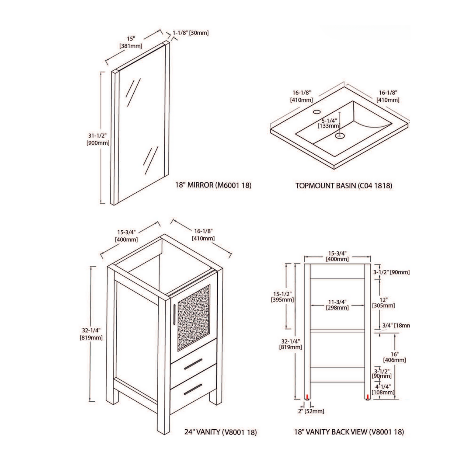 - Vanity: 15-3/4″ W x 16-1/8″ D x 32-1/4″ H